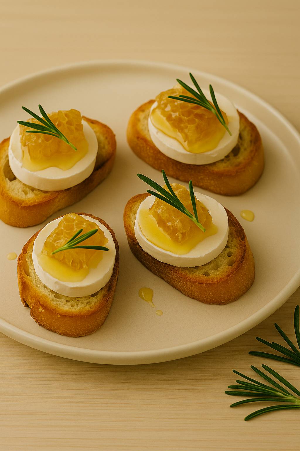 - Mit Ziegenkäse belegen und ein kleines Stück Wabenhonig daraufsetzen.